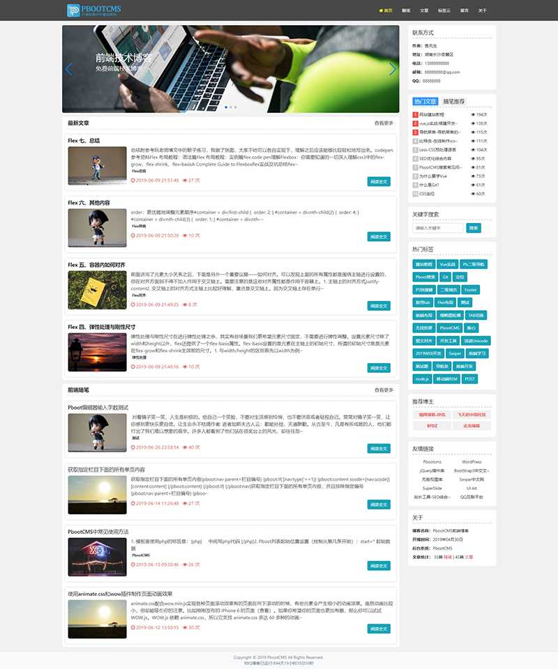 PbootCMS简洁响应式前端个人博客模板整站源码,本模板为响应式布局,多端自知应,适合知识技术类博客使用,后台栏目字段有进行修改,建议使用整站源码。