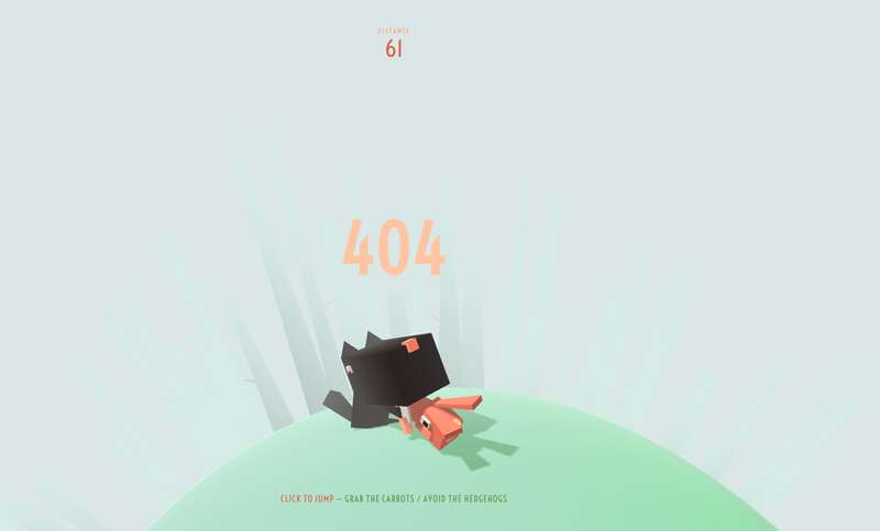 这是一款带创意小游戏的404错误页面,该游戏为小兔子疯狂奔跑抢胡萝卜躲避刺猬和狗,只需要鼠标操控即可完成游戏,画面丰富生动,体验很棒。